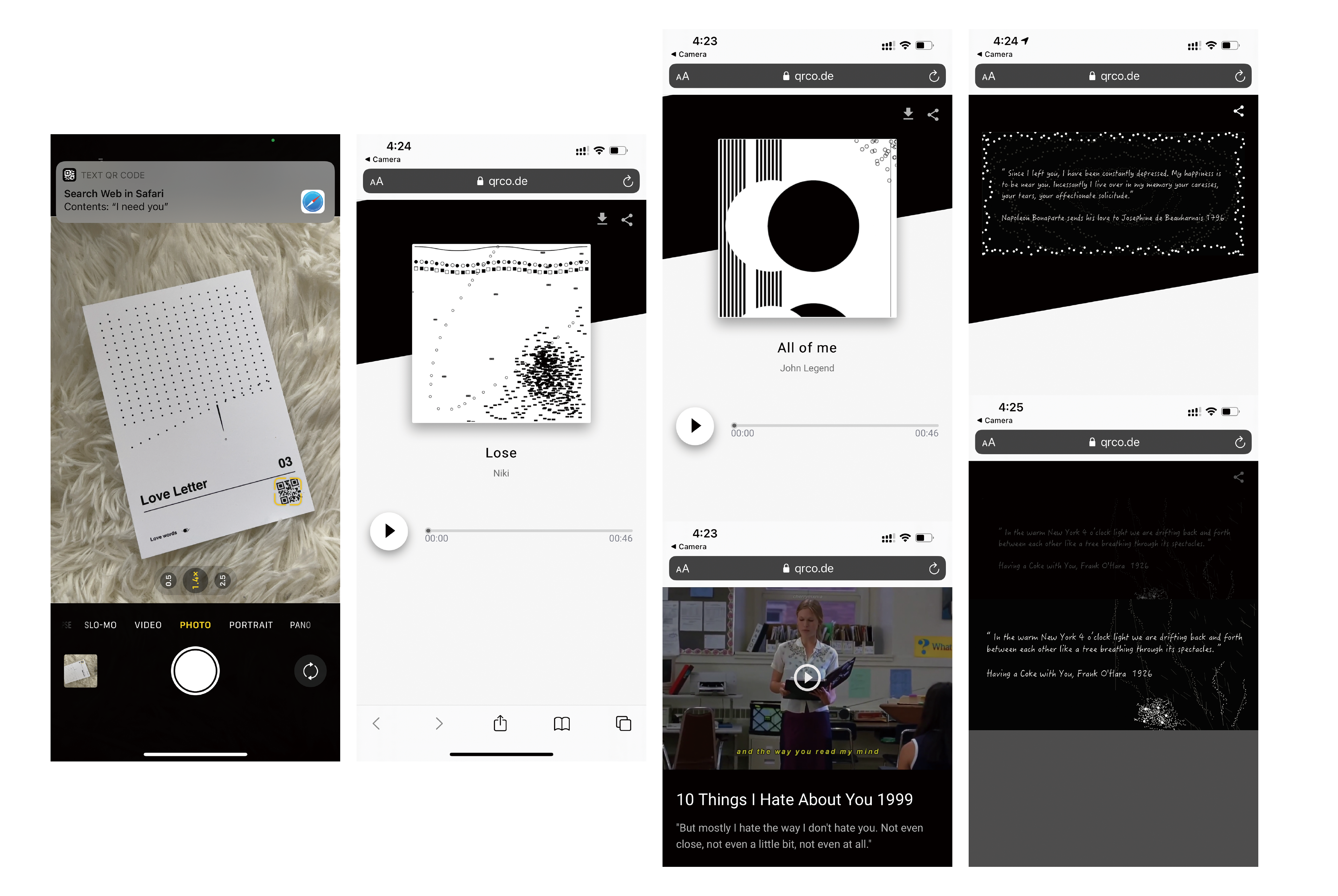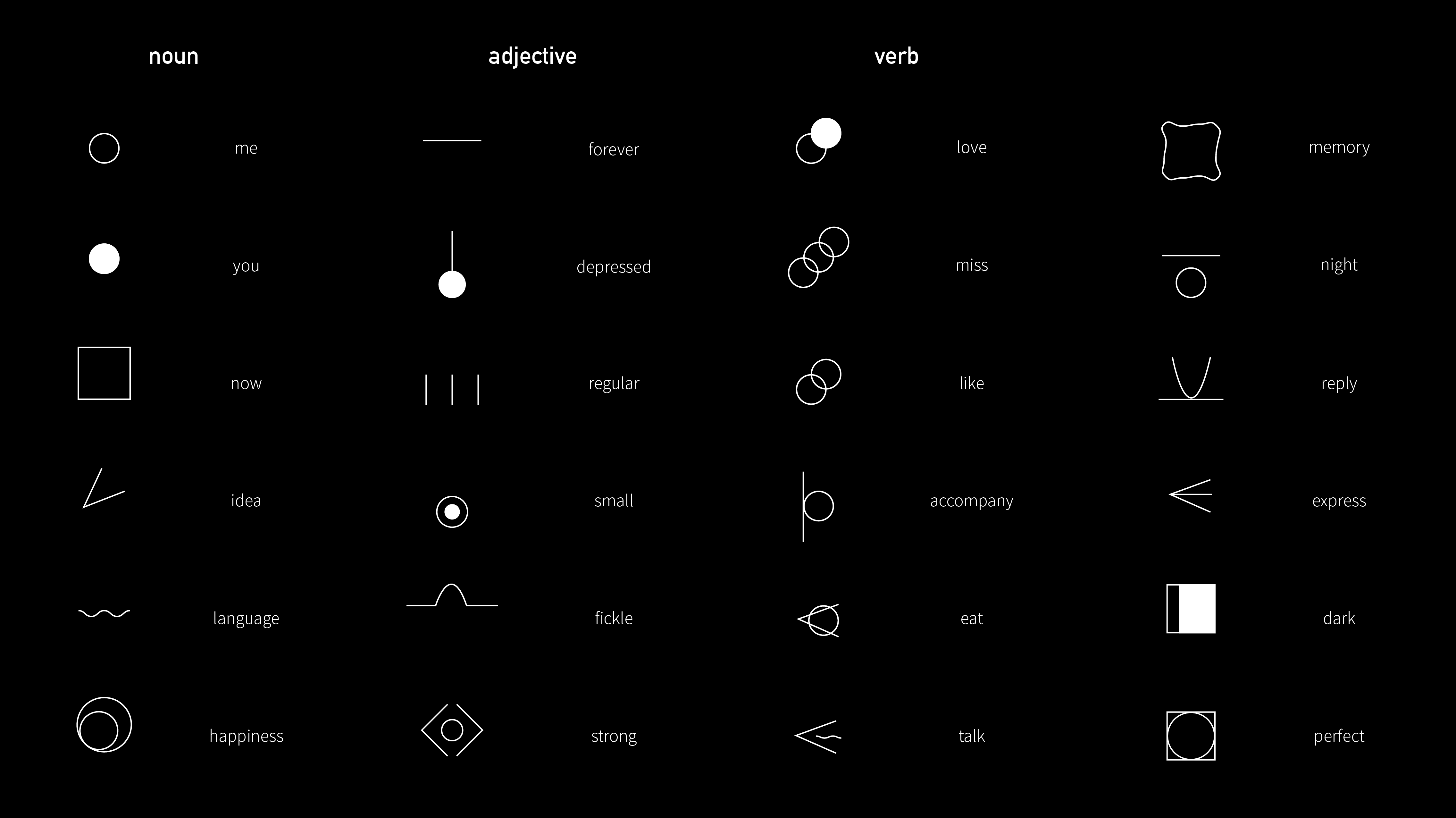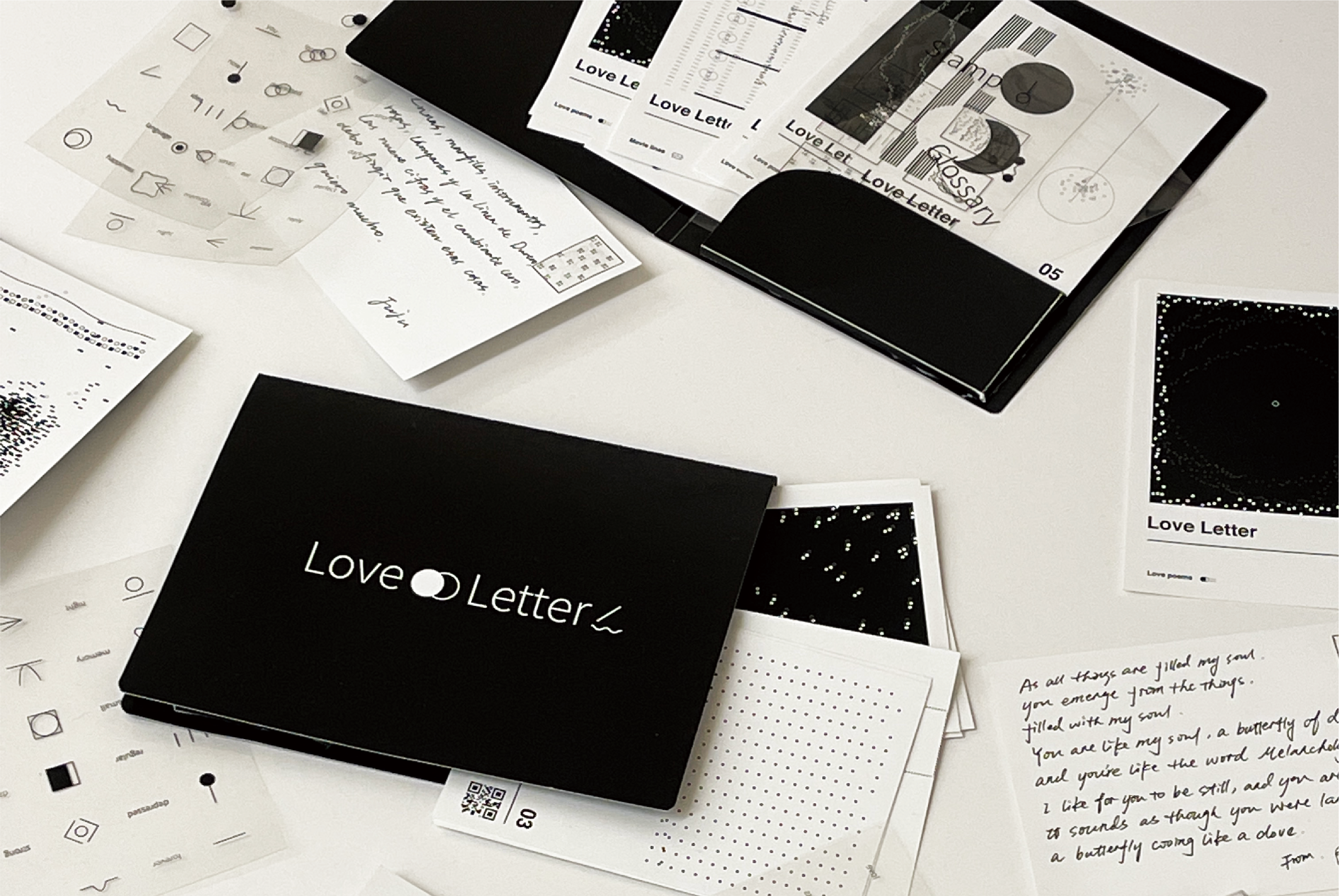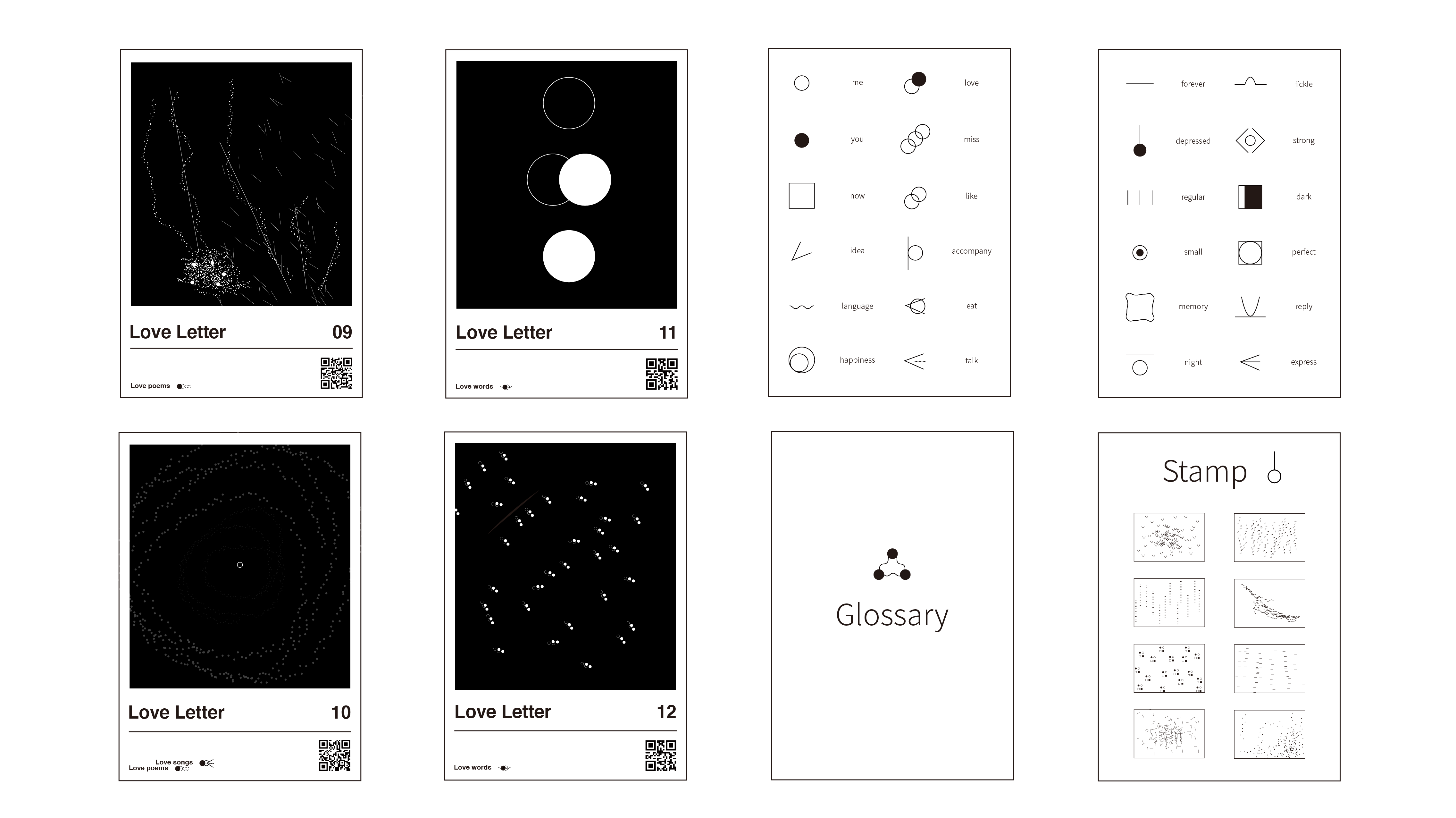The project was completed by "code", an abstract visual language that I built myself. The inspiration comes from long-distance love. Most of this communication is based on texts, and many couples feel very frustrated because of this. In my project "Love Letters", I used my visual language to create a set of coded postcards to convey "love words" between couples. Both couples can use a Glossary to understand the postcard or scan the QR code to listen to music clips or movie clips. The viewers enjoy the communication and interaction of visual language in the random, repetitive, and overlapping visual symbols.