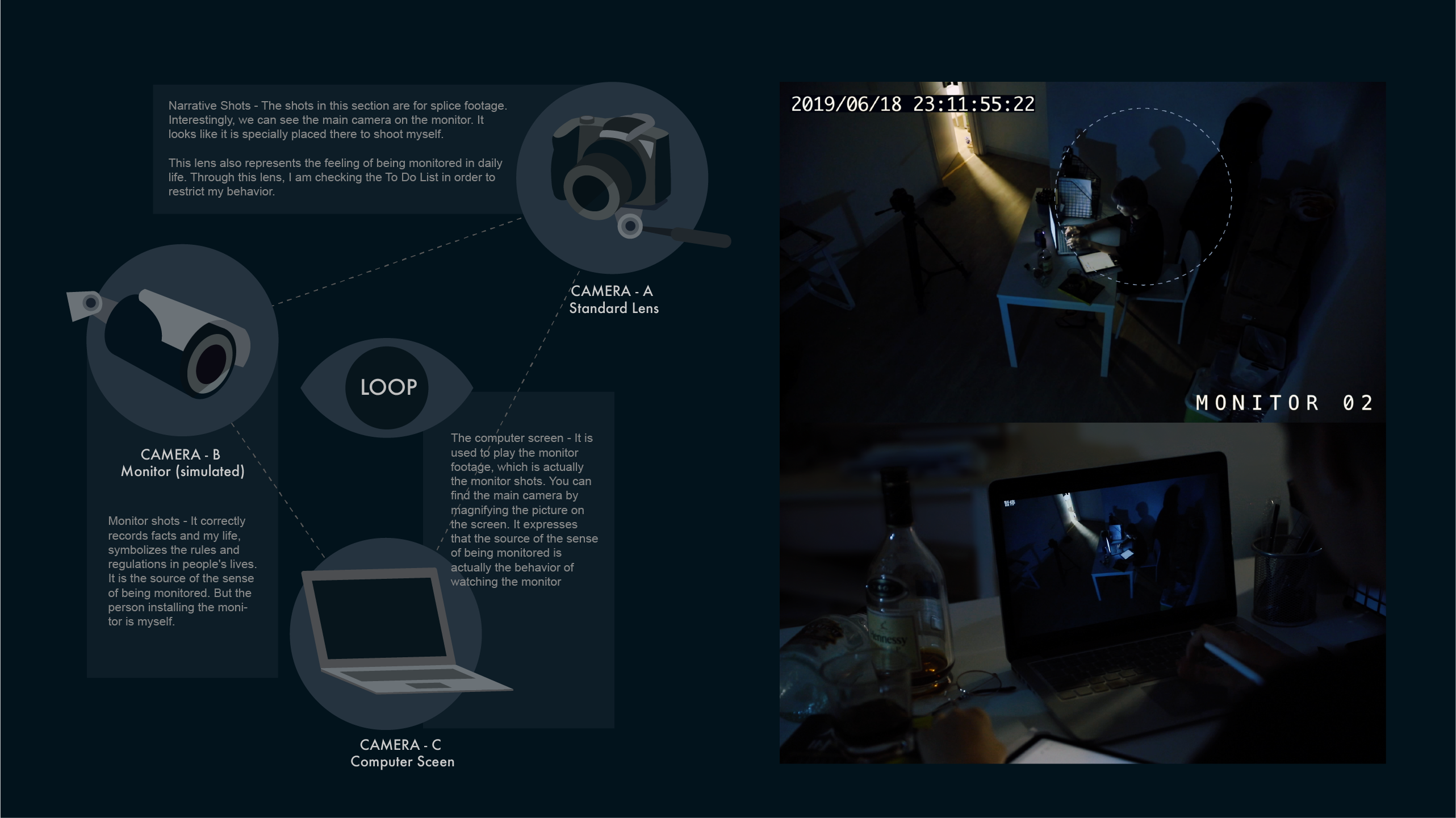 This project illustrates that people living in modern society often feel a sense of being monitored. Because of this, people force themselves to restrain their behavior. But what this video wants to say is that in fact, this sense of being monitored usually comes from people themselves. The monitor, the person being monitored, the person who monitors the monitor seems like a loop.